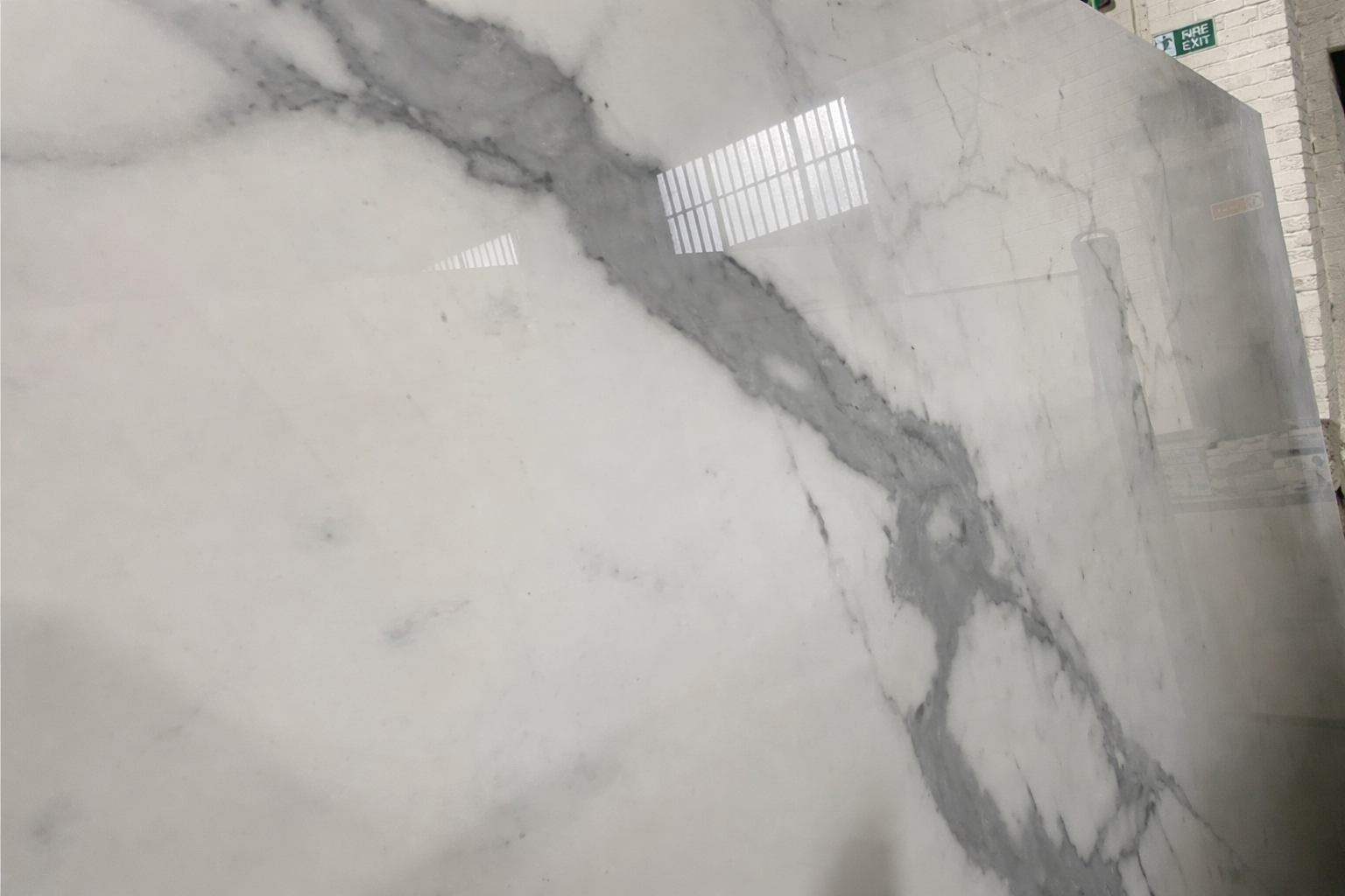 Bianco Calacatta Shiny: This ceramic features a bright white background with bold, flowing grey veining and a high-gloss finish. Part of our large Ceramic collection and is available in 6mm.
