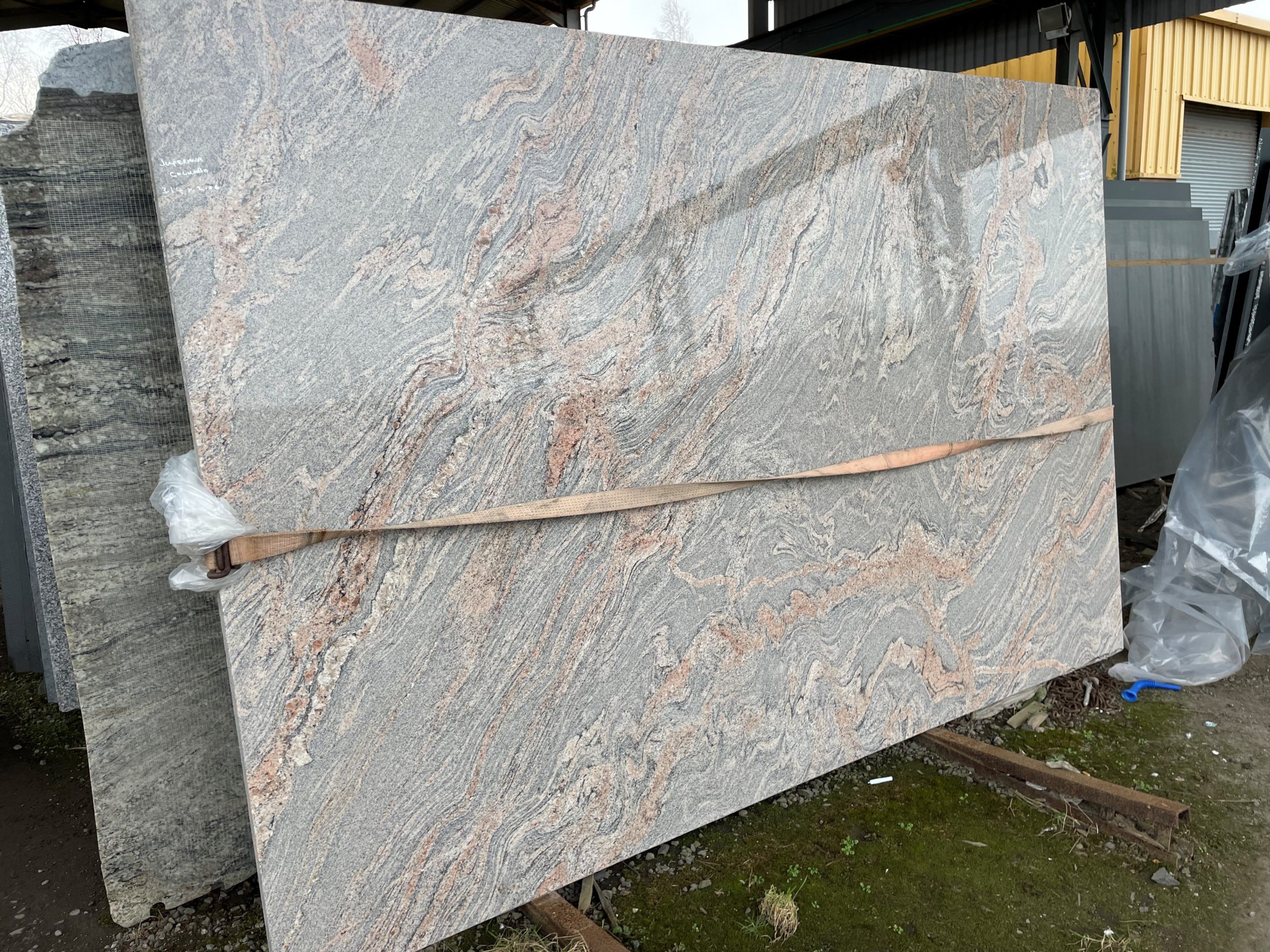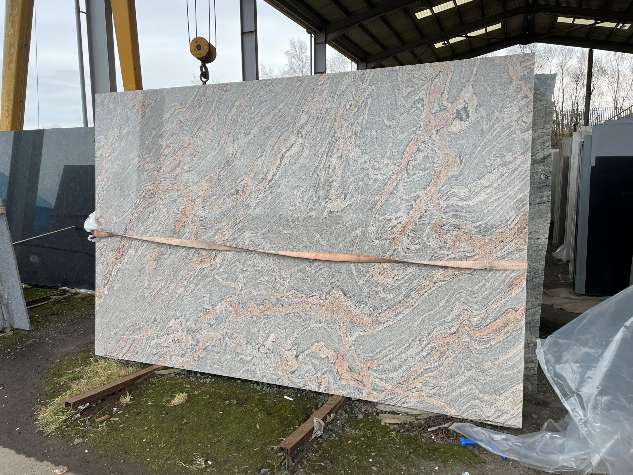 Juparana Columbo: A grey base with flowing waves of soft cream and warm peach tones running throughout, originates from India and is available in 20mm and 30mm
