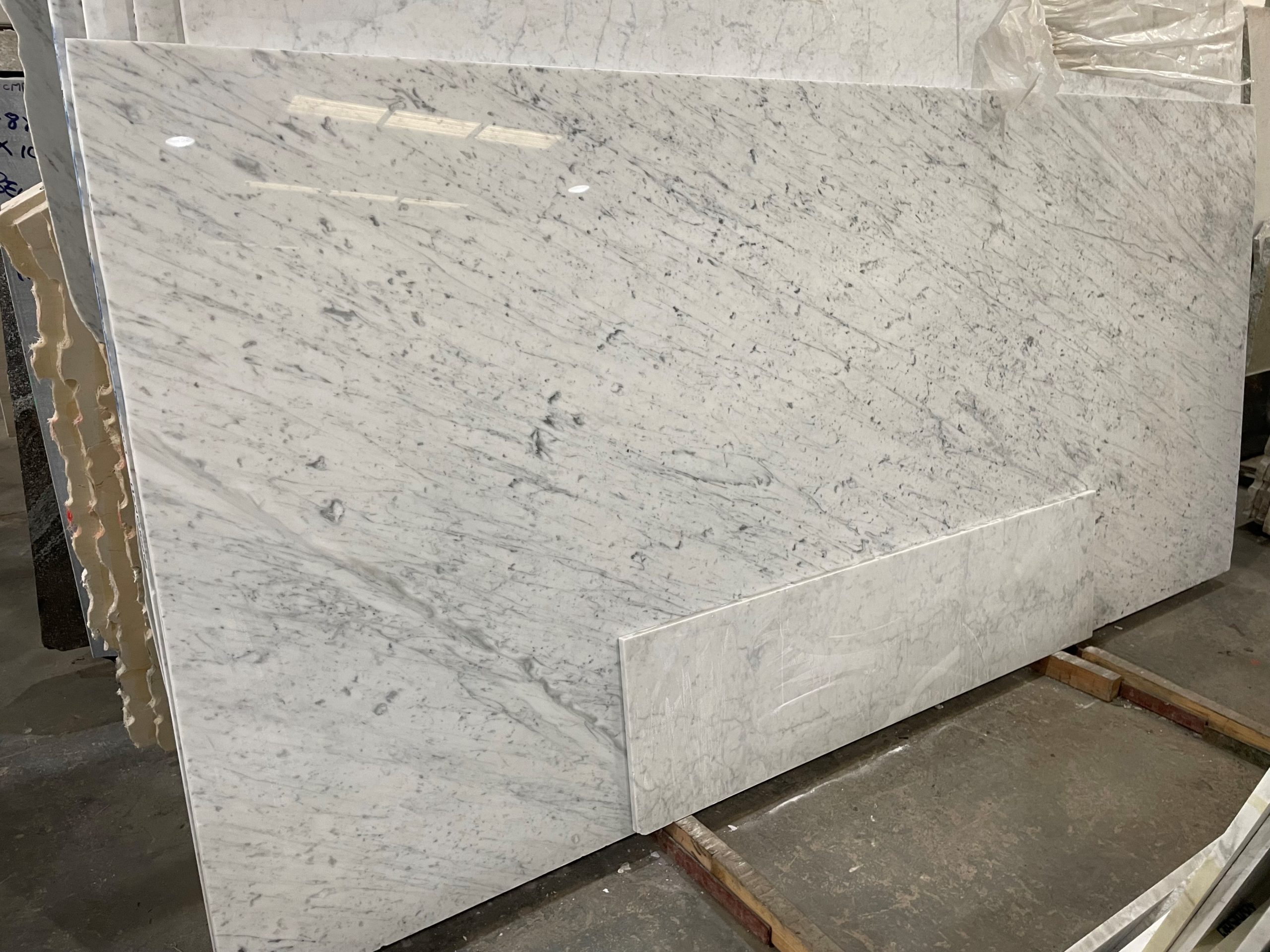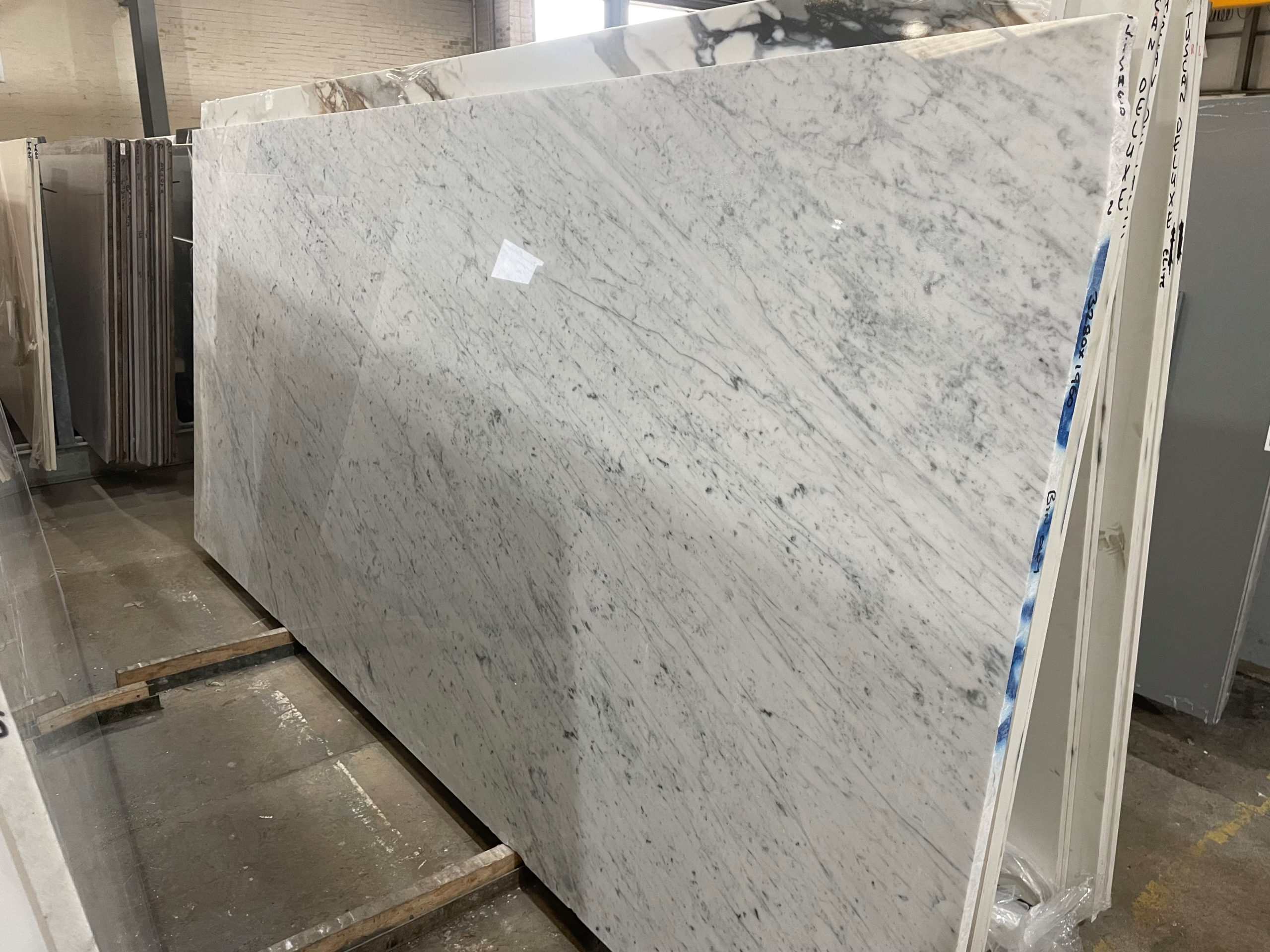White Carrara Gioia (polished): A classic white marble with soft, fine grey veining scattered throughout. This marble is imported from Italy and is available in 20 mm and 30mm